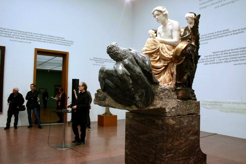 Klingers Beethoven, einst 1902 für die Wiener Secessionsausstellung bestimmt und für das Gesamtkunstwerk im Secessionsgebäude in Wien gedacht, ist heute noch beeindruckend. Die Skulptur, die lange Zeit im Leipziger Gewandhaus ungefähr an der Stelle stand, wo sich einst im Kunstmuseum am Augustusplatz bis zur Bombennacht 1943 auch die Klingerrotunde befand und bis 1941 Planungen vorangetrieben wurden, im heutigen Lennépark einen größeren Nachlassbau für Klinger zu errichten, atmet heute noch immer den Geist der damaligen Zeit.