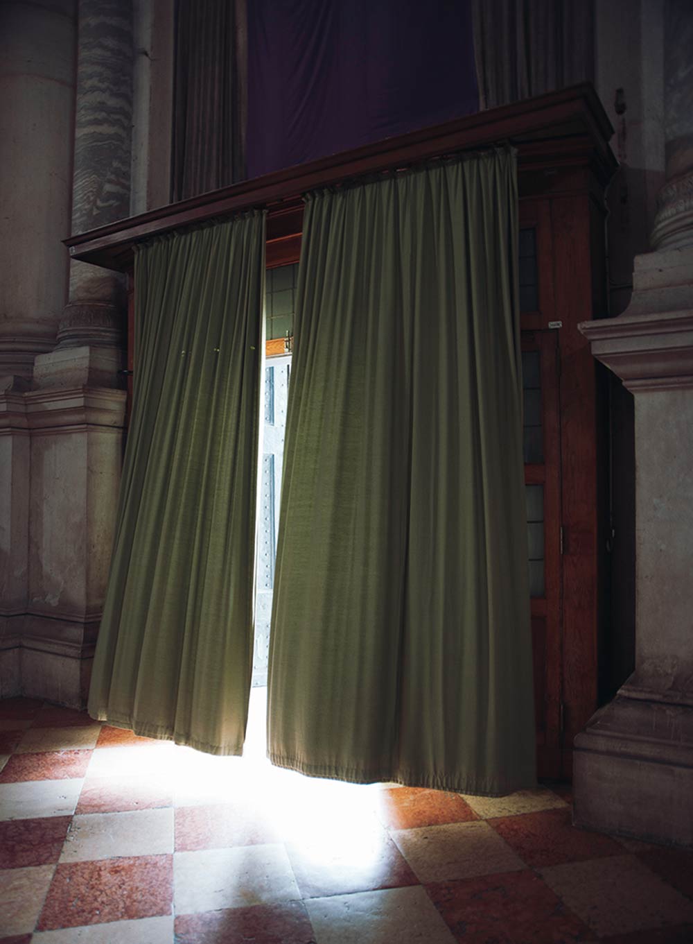 Klassische symbolische Einheiten sind dieser Brechung unterworfen: Der Regenbogen über einem rauen Seeufer wird nicht nur durch die Glasscheibe verdoppelt – der Spalt, der sich daraus ergibt, wiederholt sich in dem rahmenden Vorhang wie in einem Theater. Die Natur als Bühne, aber hinter Glas. Niemand vermag zu sagen, welches dieser Lichtphänomene denn eigentlich das ,Wahre‘ wäre – beide sind sie gleich immateriell. Das ist es, was die Unschärfe ausmacht: another belief – ein Anderes, ohne dass genauer bestimmt wäre, worin es eigentlich besteht.“