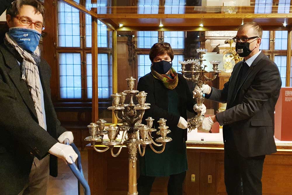 Dr. Ansgar Scholz (Kulturamt der Stadt Leipzig), Dr. Maike Günther (Kuratorin für Stadtgeschichte bis 1800) und Dr. Anselm Hartinger (Direktor Stadtgeschichtliches Museum) sichern das wertvolle Silber-Objekt der Ratsstube. Foto: Stadtgeschichtliches Museum Leipzig, Katja Etzold