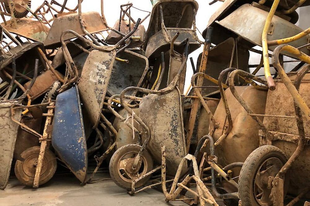 Für seine raumgreifende ortsspezifische Installation arrangiert der Künstler hundert alte Schubkarren, die er von Arbeiter/-innen in Ghana eingesammelt und im Austausch gegen neue Modelle erhalten hat.