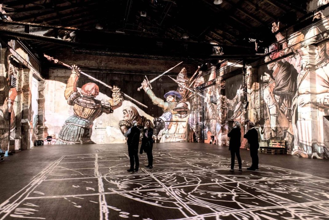 „The Great Circle“ ist eine immersive Multimedia Installation des New Media Künstlers Franz Fischnaller. Über die Wände der großen Maschinenhalle des Kunstkraftwerks gleiten ausgewählte Szenen aus Tübkes Bauernkriegspanorama. Untermalt von Soundeffekten werden die Figuren lebendig und die Besucher/-innen selbst Teil der 360° Inszenierung.