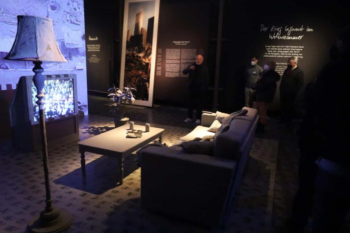 „Krieg in Zeiten von Frieden“ ist der Untertitel der neuen Panorama-Ausstellung, die man diesmal tatsächlich auf dem Weg durch die Ausstellung betreten muss, mit der auf das eigentliche Panorama-Bild hingeführt wird. Eine Art Zeitreise aus dem Jetzt 21 Jahre in die Vergangenheit, auf der das Asisi-Team zeigt, was aus jenem 11. September 2001 und aus den zeitnah folgenden Beschlüssen des damaligen amerikanischen Präsidenten George W. Bush und seiner Verbündeten geworden ist.