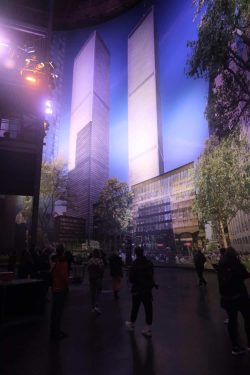 Und recht hat er. Denn genau das passiert, wenn man nach dem Gang durch die Ausstellung in die große Rotunde tritt und auf einmal in einem New York steht, das noch nichts davon weiß, was in 5 Minuten passieren wird. Die beiden Zwillingstürme stehen noch hellerleuchtet im blauen Himmel. Autos lärmen, ab und zu eine Sirene, Menschen murmeln.