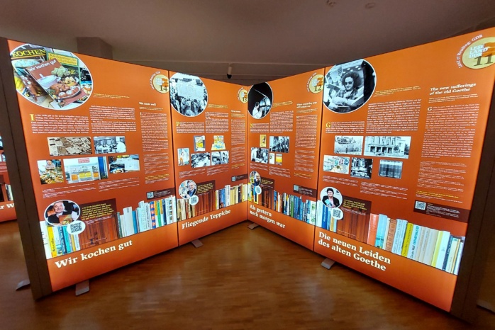Die Ausstellung lädt aber auch in die Welt der Krimis, Märchen und Science-Fiction ein, sie berichtet von der Literatur aus der Sowjetunion, den schreibenden Arbeitern des sozialistischen Realismus, und lässt die Ausstellungsgäste in alte Kochbücher blicken. Die Schau wirft Schlaglichter auf die grenzüberschreitende Kraft, welche die deutsch-deutschen Schriftstellerkontakte, das Radio und Fernsehen, aber auch die Bücher entfalteten, die Weltreisen über die Mauern des Landes hinweg ermöglichten. Mit den Schriftstellerinnen und Schriftstellern in der Friedlichen Revolution und der DDR als Thema der Gegenwartsliteratur endet die Zeitreise.