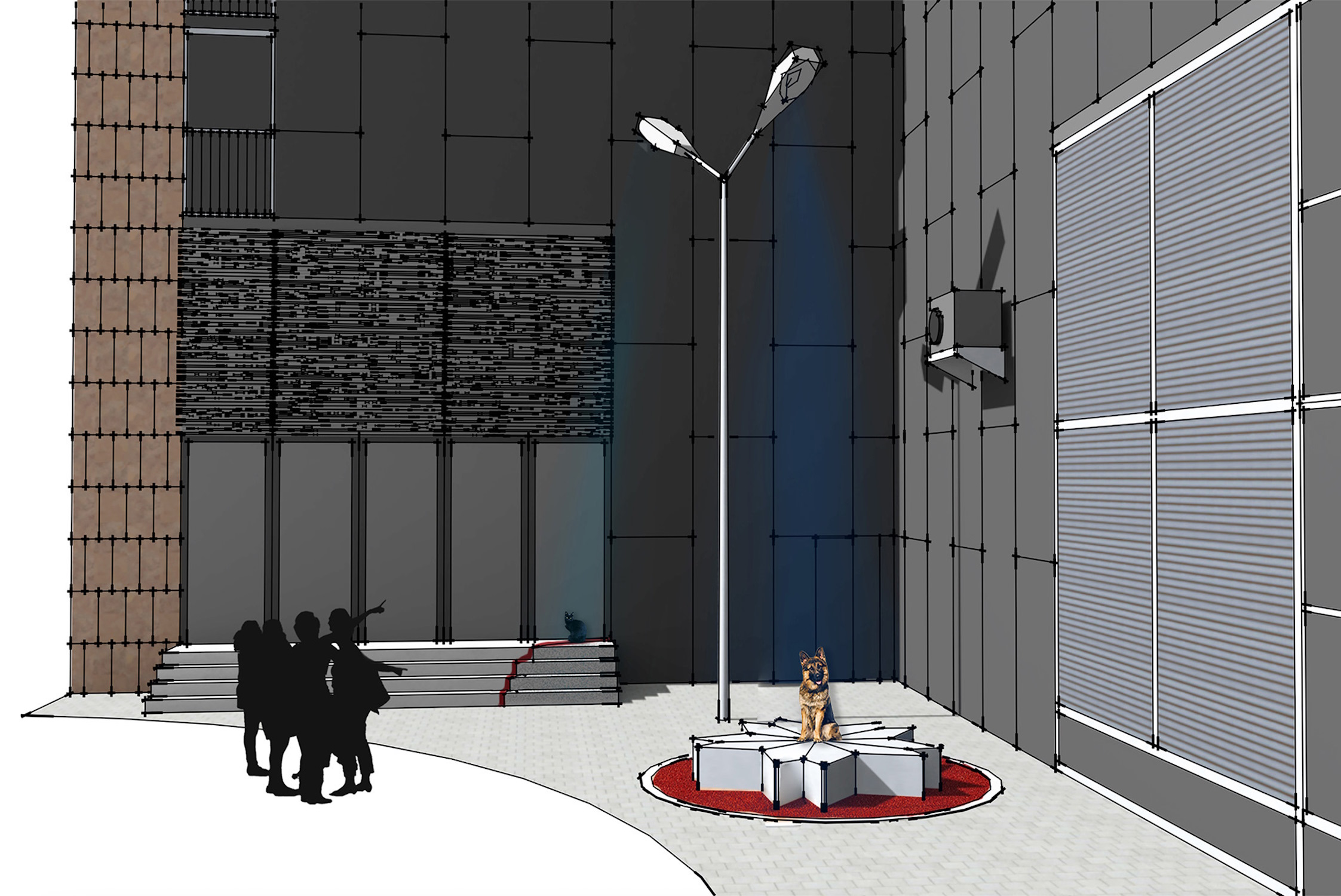 Eine der beiden Lampen lenkt den Blick auf den flachen silbernen „Stern“, der auch als Bühnenpodest oder Sitzskulptur dienen kann. Die andere richtet ihren Lichtkegel auf die bestehende Außentreppe. Mit der künstlerischen Arbeit wird Erinnerung im Stadtraum an konkreten Objekten festgemacht.