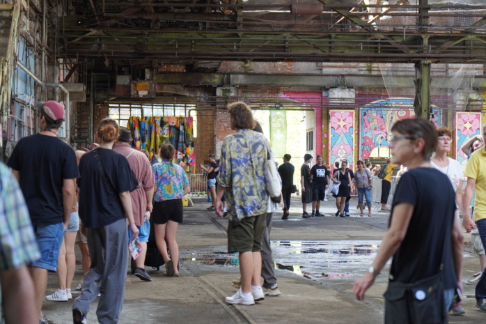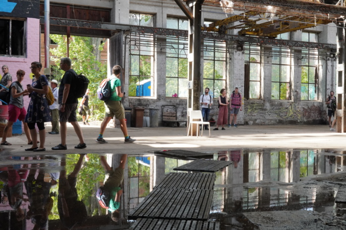Über Nacht hat es reingeregnet in die Ausstellungsräume. Schlimm ist das nicht, ganz im Gegenteil: In den Pfützen spiegeln sich die bunten Farben der Kunstwerke und durch die Löcher im Dach sieht man den Himmel. Für drei Wochenenden ist das ehemalige Reichsbahnausbesserungswerk (RAW) Engelsdorf zur Ausstellung geworden. Eingenistet haben sich knapp 80 Künstler*innen, Solisten und Duos im Rahmen der Industriebrachenumgestaltung (ibug), dem „Festival für urbane Kunst“.
