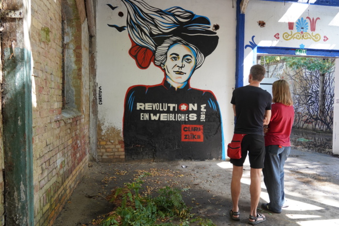 Oder die feministische Kunst eine*r Künstler*in mit Signatur CHERTOИ. Ein großformatiges Porträt von Clara Zetkin und mit dem Titel „Revolution ein weibliches Wort“. Progressiv, tolerant und weltoffen präsentiert sich die Ausstellung.