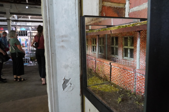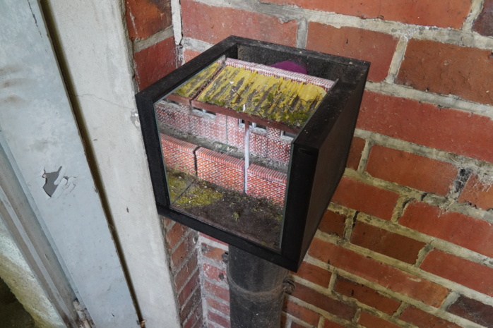 Ob es ein kleiner rosafarbener Pilz ist, der aus der Wand ragt oder eine mit Gras überwachsene Malerrolle neben einem künstlichen Baum. Auch für die Kunstwerke des Leipziger „Ministreetart“-Künstlers André Schmidt brauchte es ein gutes Auge. Überall in der Ausstellung waren seine Miniaturräume versteckt. Teils eingebaut, um ein Loch in der Wand zu füllen. Oder ein Reihenhaus, das sich mit Spiegeln in eine unendliche Siedlung ausdehnt.