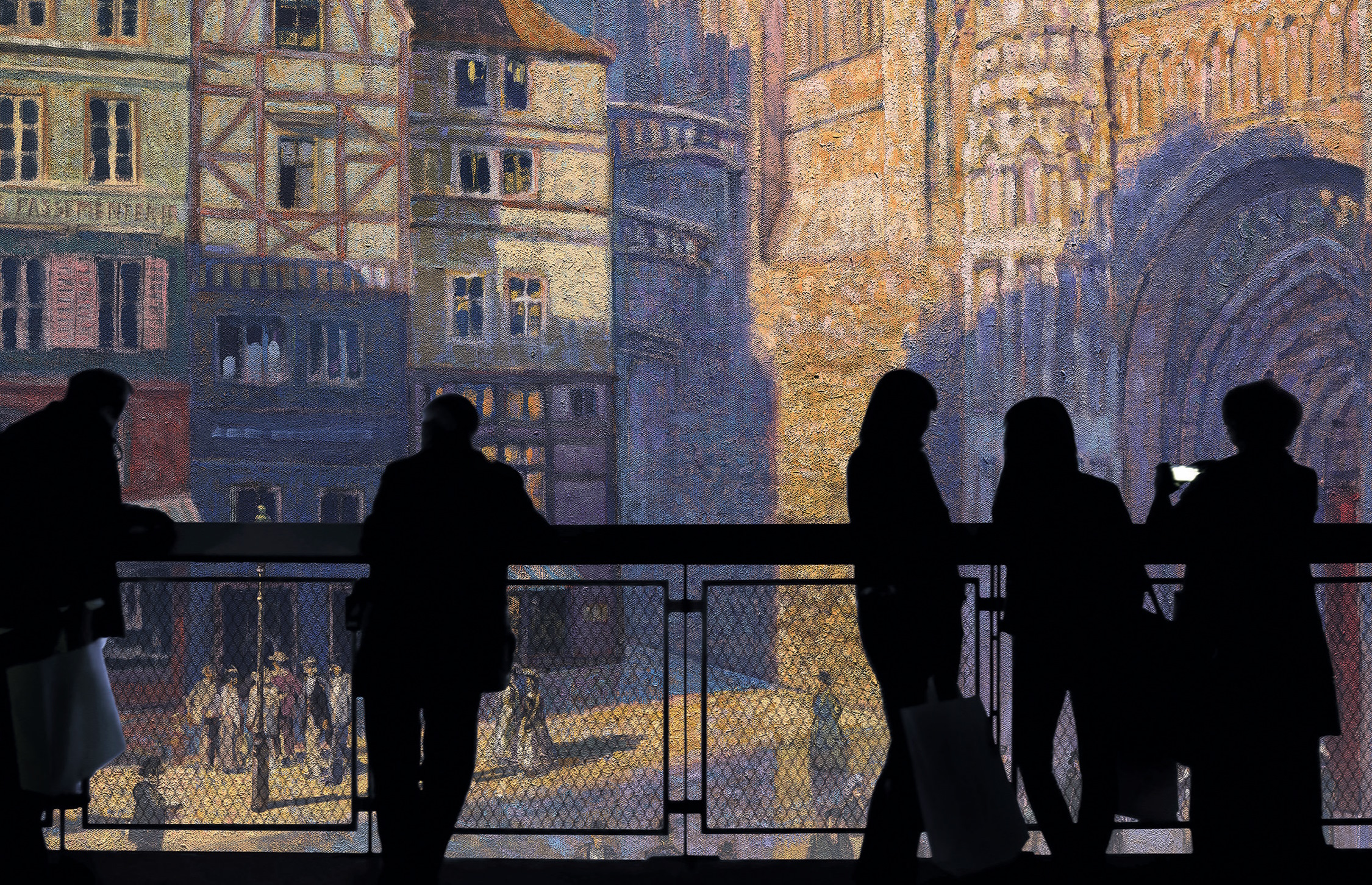 Bildbestimmend ist die Kathedrale Notre-Dame de Rouen, deren nahezu vollständig von der Abendsonne beschienene Fassade ihr orange-rotes Licht über den Vorplatz auf die bereits verschatteten Häuser zurückwirft. Ein vielfältiges Spiel von außergewöhnlichen Farbnuancen, Schattierungen und Lichteinfällen ergießt sich über die gesamte Szenerie. In den Gassen hält Asisi bekannte Maler und Zeitgenossen wie Vincent van Gogh, Auguste Renoir und Claude Monet fest.