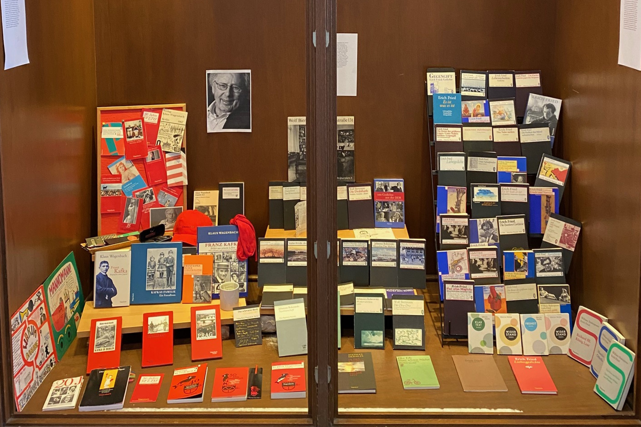 Als erste fertig wurde die Ausstellung in der Vitrine im Städtischen Kaufhaus gegenüber Max Enk. Hier sind speziell die Kafka-Bücher ausgestellt. Klaus Wagenbach bezeichnete sich ja als die „dienstälteste lebende Witwe Kafkas“. Zu sehen sind hier aber auch die Bücher von Erich Fried und Wolf Biermanns in der DDR verbotene Titel – „Dra-Dra“ etwa und die „Drahtharfe“.