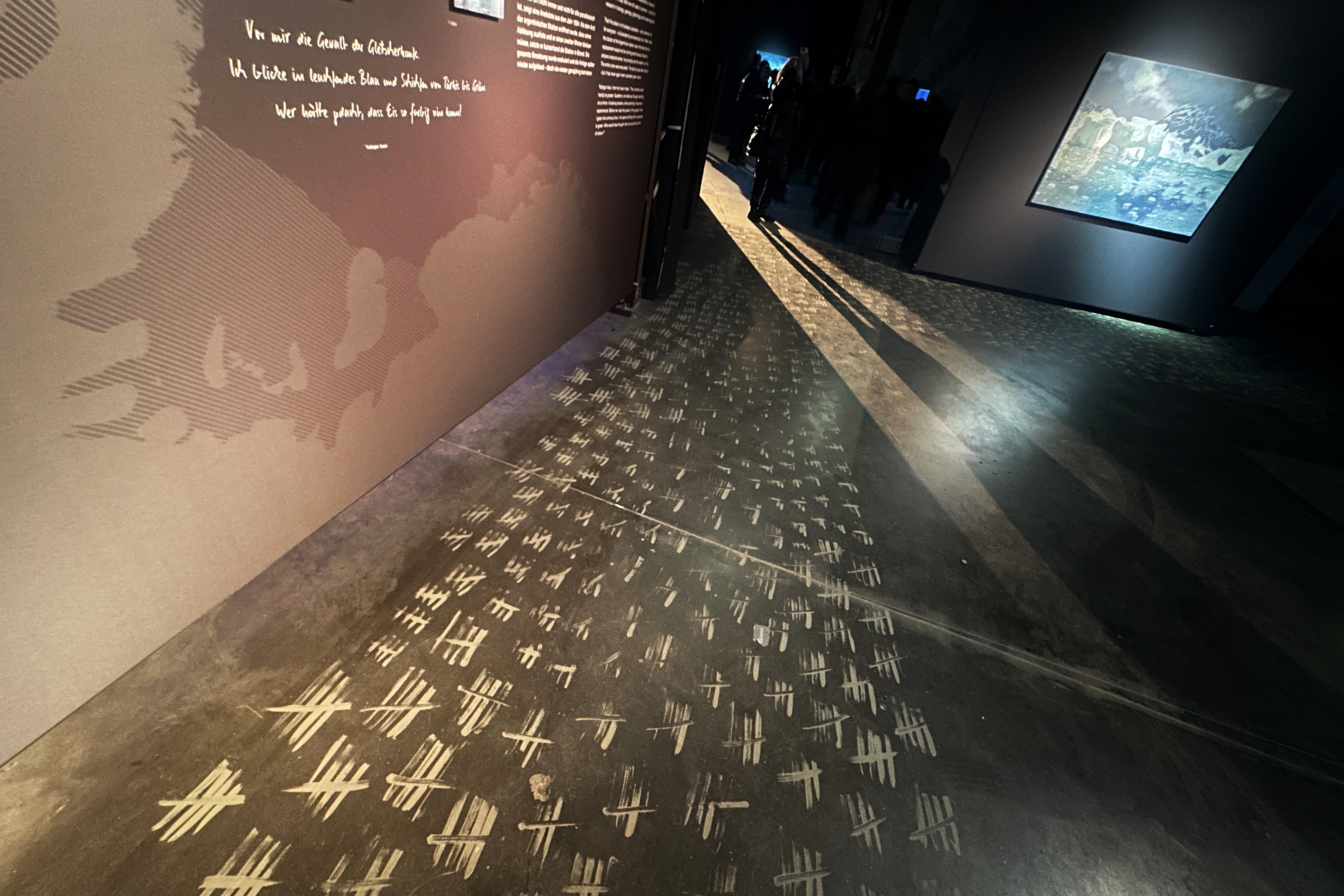In der Begleitausstellung stellt der Künstler ein Kräfteverhältnis dar. 88 Flaggen von Ländern, die jetzt schon in der Antarktis forschen und engagiert sind, hängen 15 Portraitfotos von dort lebenden Tieren gegenüber. Eine bedrückende Enge in Dunkelheit, bevor man das eigentliche Rund des Panoramas betritt.