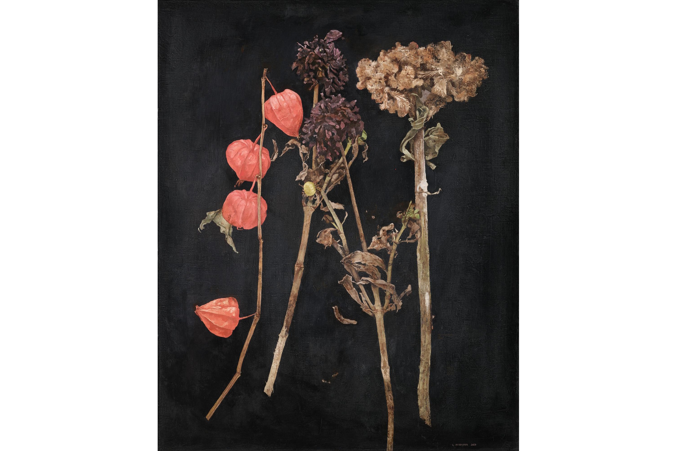 Malerisches und Grafisches überlagern sich, helle und dunkle Zonen verschieben die Ebene, bis die Dinge zwischen Gegenständlichkeit und Abstraktion schwebend verankert sind. Die dunklen Gründe der Blumenbilder erinnern an barocke Vanitas, doch das Pathos weicht einer präzisen, fast schon nüchternen Erfassung: Überreste ehemaligen Lebens, akribisch vergrößert und ins Licht gerückt.