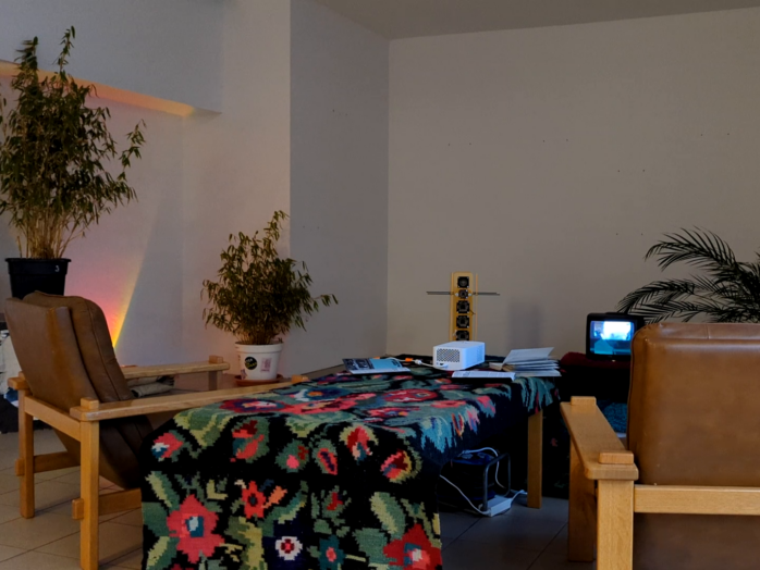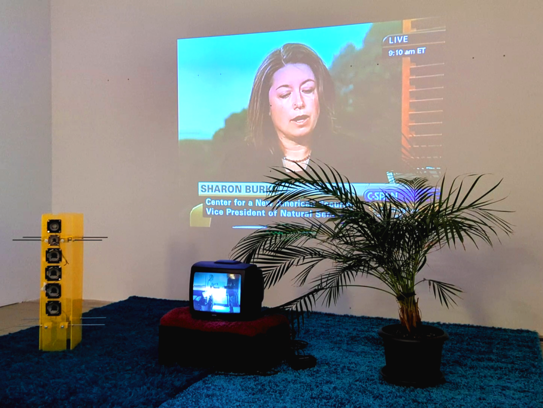 In seiner Installation „Back Home! A Journey Through The Rise (And Fall?) Of The Capitalocene“ (dt. Zurück nach Hause! Eine Reise durch den Auf- (und Ab-)stieg des Kapitalozäns) verarbeitet der Künstler Aleksi Kuesy die Hoffnungen und Enttäuschungen über die Klimapolitik der letzten 40 Jahre. Auf zwei Bildschirmen laufen parallel Videos aus der Popkultur und dem Fernsehen; Bilder, die wir alle kennen, in einen neuen Kontext gesetzt.