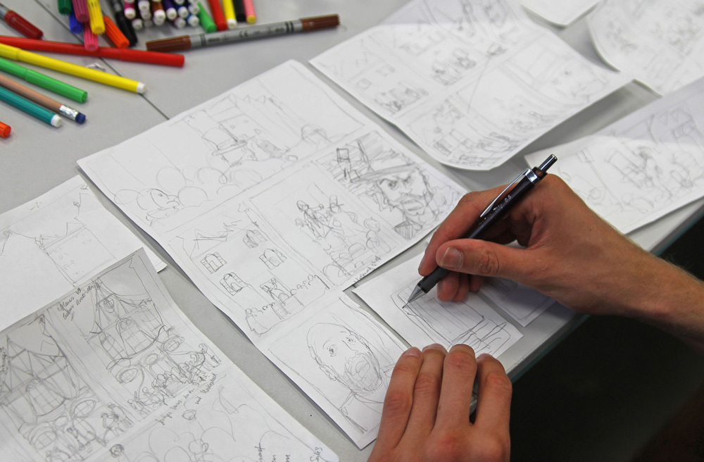 Acht Tage lang diskutierten, probierten, übersetzten und radierten, konstruierten, animierten, schmierten, texteten und schwitzten nun zwölf junge Zeichner aus Deutschland und Frankreich gemeinsam in Plagwitz. Sie waren bestens betreut, denn das Forum hatte gleich zwei bekannte Comiczeichner zum Workshop eingeladen. Angeleitet von den Workshop-Dozenten mawil aus Berlin (ausgezeichnet mit dem Max & Moritz Preis 2014) und Yassine aus Paris wurde Panel um Panel gezeichnet, an Zeichen- und Erzählübungen herumgefriemelt und wurden zwölf Storyboards entworfen und gezeichnet.