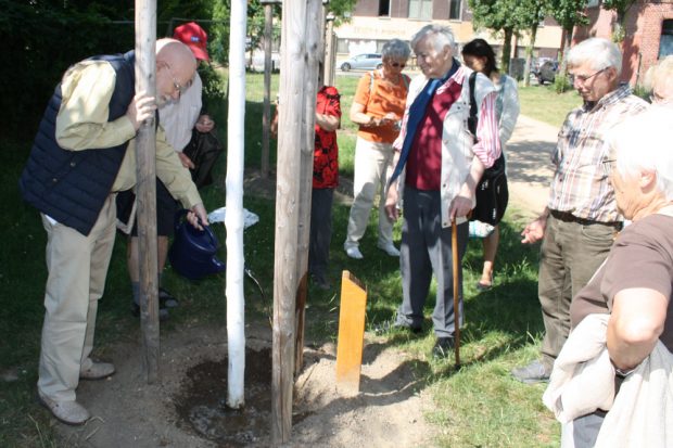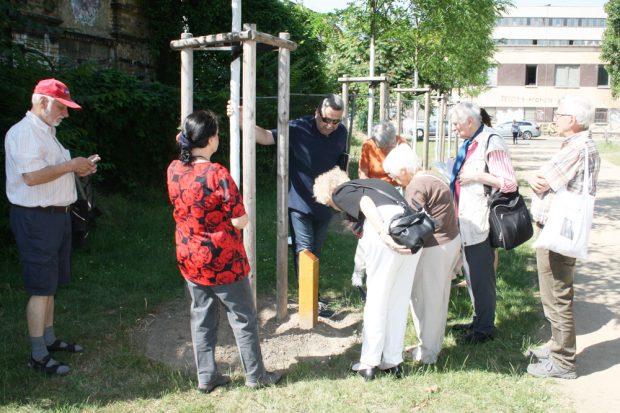 „Eigentlich wollten wir ja wirklich einen Baum pflanzen“, erklärt Klaus Petermann, Vorsitzender der Lene-Voigt-Gesellschaft. Aber das war so im Lene-Voigt-Park nicht möglich. Da hat das Amt für Stadtgrün und Gewässer seine Hand drauf, dass alles ordentlich im Rahmen der Parkgestaltung passiert. Aber die Robinienreihe zur Reichpietschstraße ist noch jung.