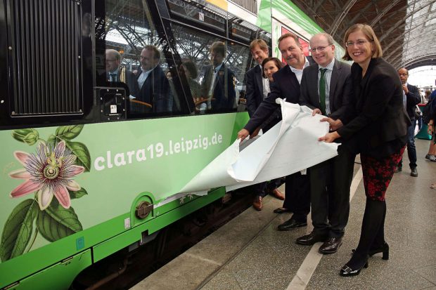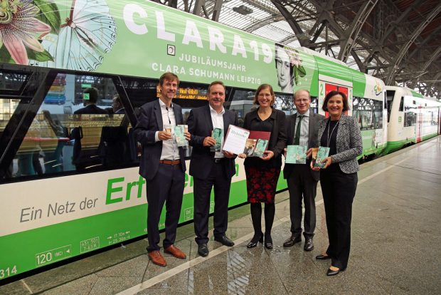 Dr. Skadi Jennicke, Bürgermeisterin und Beigeordnete für Kultur der Stadt Leipzig sowie Schirmherrin von CLARA19, erinnert daran, dass Clara und Robert von Anfang an mit Begeisterung die Eisenbahn nutzten, zu Zeiten, als andere Leute noch fürchteten, bei 30 km verrückt zu werden: „Clara Schumann reiste wie keine zweite Künstlerin des 19. Jahrhunderts. Mit dem Ausbau des Zugnetzes fuhr sie europaweit zu Konzerttourneen. Die Künstlerin gestaltete so eine europäische Kultur mit, die als neugierig und tolerant beschrieben werden kann. Mit dem Festjahr CLARA19 laden wir viele Gäste zu einem vielfältigen Programm nach Leipzig ein. Ich bedanke mich sehr herzlich bei allen Partnern, dass wir das Festjahr CLARA19 prominent auf der Erfurter Bahn bewerben können!“