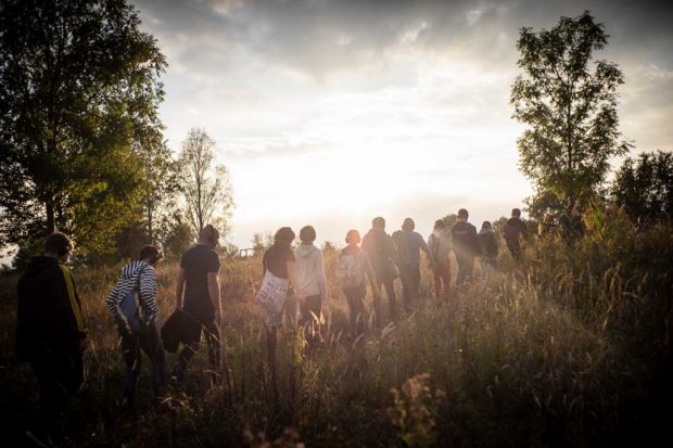 Etwa 35 Zuschauerinnen und Zuschauer spazieren gemeinsam zum Lindenauer Hafen und zu seinen Geschichten. Ausgestattet mit Kopfhörern folgen sie einer Route, die am Wasser entlang zu alten Speichern, rostigen Gleisen und klapprigen Maschinen aus vergangenen Zeiten führt, und die schließlich bei den Neubauten des Jahres 2019 endet.