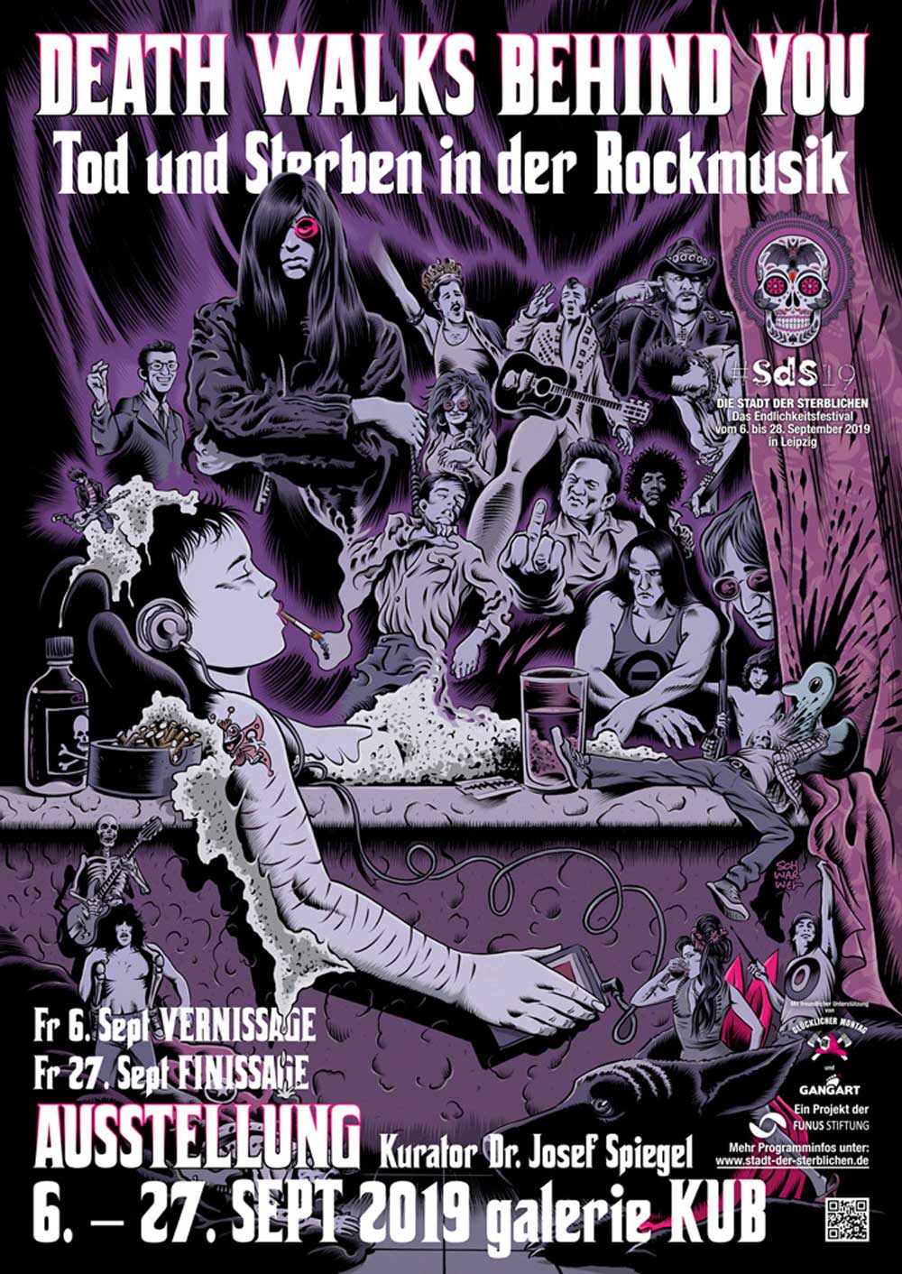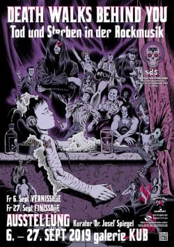 Und natürlich gibt es auch Ausstellungen, in denen unser Umgang mit dem Tod thematisiert wird. So etwa die Ausstellung „Death walks behind you – Tod und Sterben in der Rockmusik“ vom 7. bis 27. September in der Galerie KUB in der Kantstraße 18. Kurator ist Dr. Josef Spiegel in der galerie KUB. Und den Inhalt umreißt das Veranstaltungsprogramm so: „Der Tod als ständiger Begleiter – ein Soundtrack der Endlichkeit. Die Ausstellung bietet einen kursorischen und thematisch eng umrissenen Streifzug durch die Geschichte der Rockmusik. Plattencover, Songtexte, Sounds, Videos und jugendkulturelle Artefakte zeigen in bisweilen verstörenden und schockierenden Bildern markante Stationen des Themas in der Rock- und Popgeschichte vom Ende der 50er Jahre bis heute. Leitlinie des Projektes ist dabei das Verhältnis von Musikgenre, Szene und Jugendbewegung auf der einen Seite und der existenziellen Erfahrung von Tod auf der anderen Seite.“