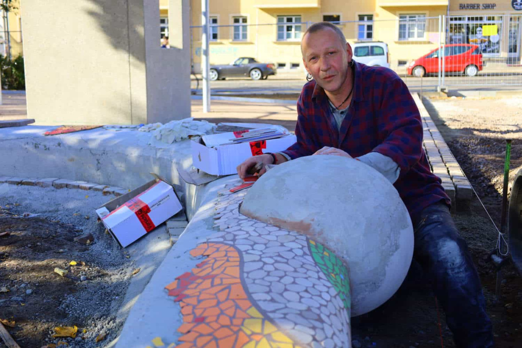 Am 14. November muss alles fertig sein. Dann soll die neu gestaltete Parkanlage am Connewitzer Kreuz fertig und der Öffentlichkeit übergeben werden. Und ein ganz zentraler Hingucker dabei wird die Bank, die der Connewitzer Künstler Daniel Schenk gestaltet – und zwar in echter Handarbeit, mit Schleifgerät und vielen kleinen Mosaikbausteinen. Die Bank wird bunt wie Connewitz.