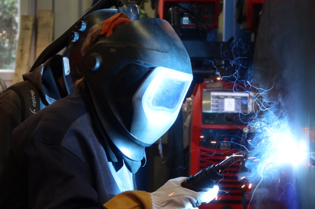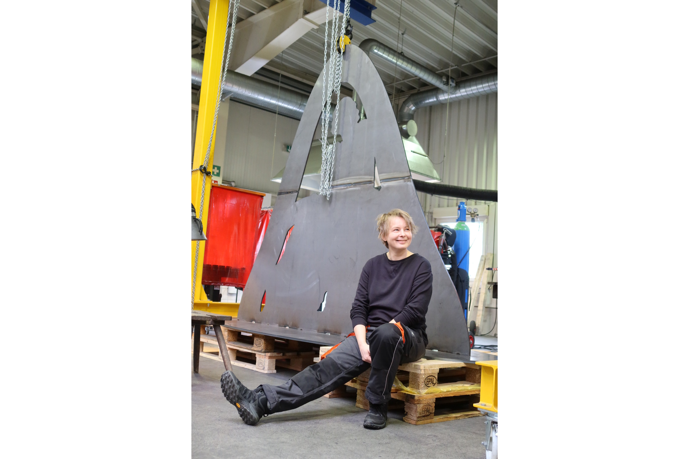 Ausgangsmaterial: Eine große Stahlplatte, aus der am 22. Februar die Konturen der am Ende 2,3 Meter hohen und 2,5 Meter breiten Skulptur herausgeschnitten wurden. Ein besonderer Termin auch für die Künstlerin, denn sie durfte auch in die Schweißermontur schlüpfen und beim Herausschneiden ihrer Skulptur helfen. Ohne Zweifel ein schöner Moment einer Kunstschaffenden, die so nicht nur selbst erlebt, wie aus ihrer Idee eine handfeste Skulptur wird, sondern so auch in die Arbeitswelt von Unternehmen schauen kann, die der Künstlerin nur zu gern helfen, ihren Einfall in ein öffentliches Kunstwerk zu verwandeln.