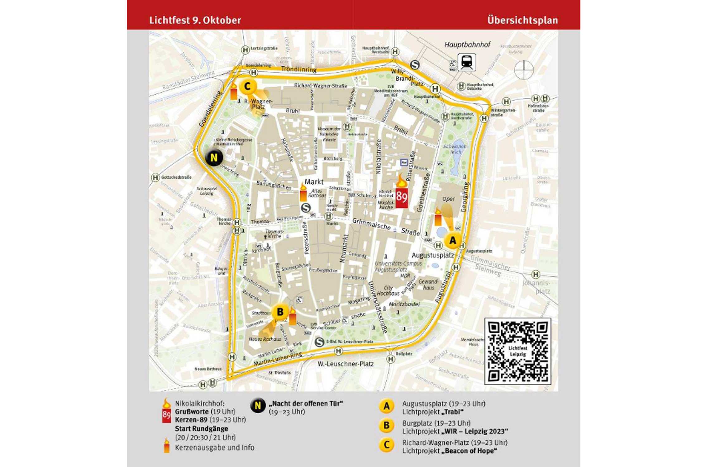 Das Lichtfest Leipzig findet auf dem Augustusplatz, dem Burgplatz und dem Richard-Wagner-Platz statt. An allen Orten sind von 19 bis 23 Uhr Lichtinstallationen zu erleben. Alle Projekte haben regionale Kooperationspartner. Auf dem Nikolaikirchhof erwartet die Besucher die Kerzen-89.