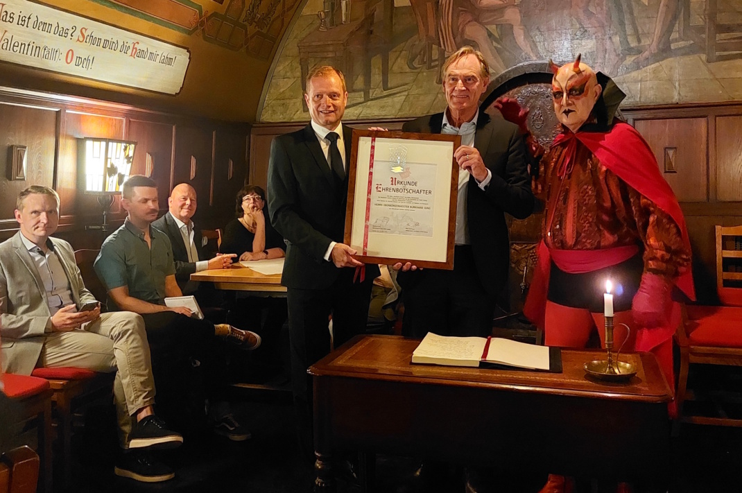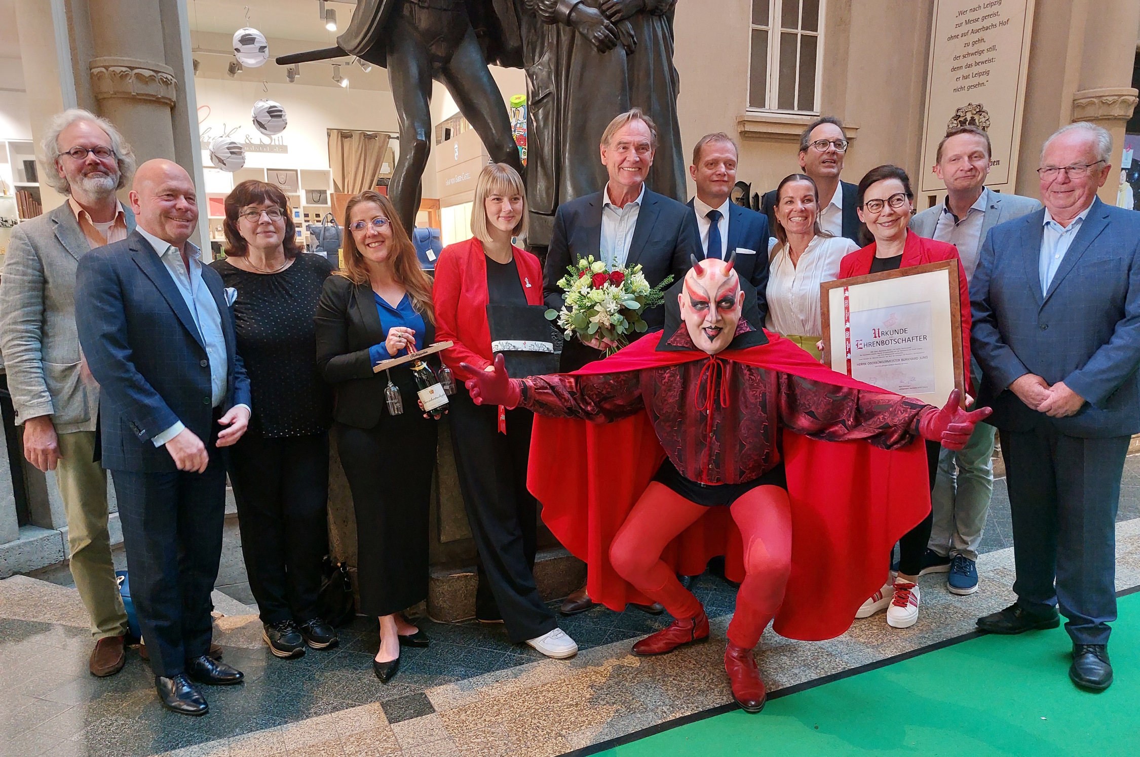 Dass auch Reisende den berühmten Keller mit Mephisto verbinden, zeigte schon sein Auftauchen am 17. Juni in der Mädlerpassage: Jeder wollte sich einmal mit dem Teufel fotografieren lassen, den Hartmut Müller kompetent und eindrucksvoll spielt. Da war die Urkunde für den Ehrenbotschafter schon weihevoll unterschrieben. Und Burkhard Jung hatte auch gleich noch einen Text für das Jubiläumsbuch verfasst, das 2025 ebenfalls veröffentlicht werden soll.