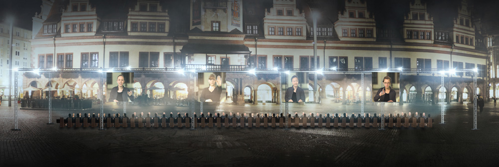 Die andere und weitaus spektakulärere Bestimmung des Gesamtobjekts wird allerdings erst mit der intermedialen Konzertinstallation sichtbar, die in Leipzig am Samstag, 2. September, zu erleben sein wird, in Erfurt dann am folgenden Samstag, 9. September, und in Wittenberg am 16. September. Hierfür nehmen 95 SängerInnen an der Tafel Platz und bringen eine ebenso eindringliche wie spektakuläre rund 35-minütige transmediale Komposition des Komponisten und Medienkünstlers Thomas Christoph Heyde zur Uraufführung.