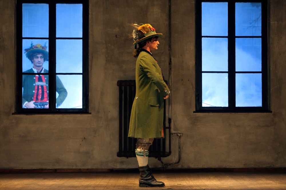 Regisseur Paul Esterhazy, der auch Konzept und Raum entwickelte, konfrontiert den Zuschauer im Laufe des eineinhalbstündigen Abends mit einer Vielzahl von Fremden und Hochzeitern. Die Zwillinge Jiri und Otto Bubenicek, beides erfahrene Balletttänzer, sowie modernde Projektionstechnik machen’s möglich. Die Inszenierung folgt schnörkellos der überschaubaren Handlung. Alle Ortswechsel werden mit schnellen Videofahrten über Felder und Wiesen visualisiert. Das szenische Spiel der Bubenicek-Zwillinge mit ihren digitalen Doppelgängern hat eine gewisse Situationskomik.