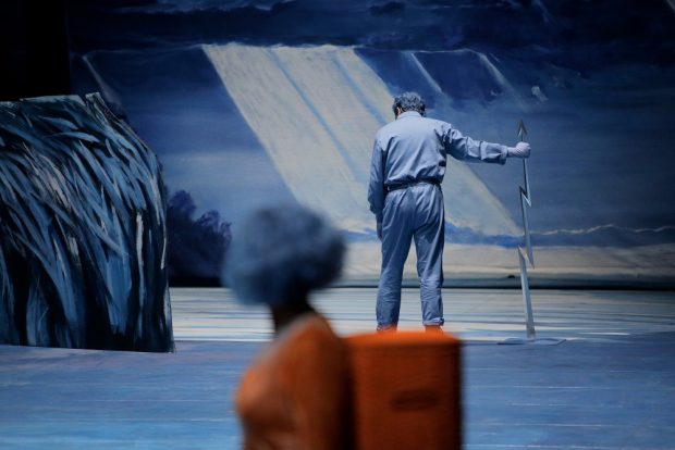 Wichtigstes Bühnenelement ist ein breiter Rundbogen, den das Künstlerpaar in den Theaterwerkstätten der Dresdner Semperoper mit Bäumen, Wolken und Lichtstrahlen bepinselt hat. Davor steht eine Transformatorstation in Delfter Kachelblau. Für die Künstler – so ist im Programmheft zu lesen – ein Bruch in der Lineatur rationaler Abläufe, aus denen das Geheimnisvolle in die Wahrnehmung trete. Zugleich böte die Konstellation mannigfaltige assoziative Anknüpfungspunkte.