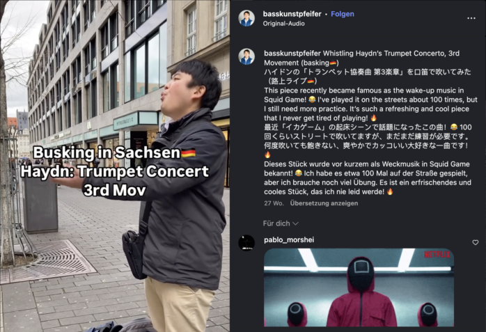 Auf der Social-Media-Plattform Instagram betreibt Matsumura einen eigenen Kanal. Wenige Nutzer folgten ihm dort. Bis zu diesem Tag im Februar 2024. In der Petersstraße hat er seinen kleinen Lautsprecher aufgebaut, der ihm die Begleitmusik für sein Pfeifen spielt. Es sind vor allem junge Leute, die stutzen und stehen bleiben. Zwar sind die wenigsten von ihnen Fans von Joseph Haydn. Doch die Musik, die zwischen Zara und McDonalds erklingt, kommt ihnen vertraut vor. Es ist der 3. Satz von Haydns Trompetenkonzert in Es-Dur.