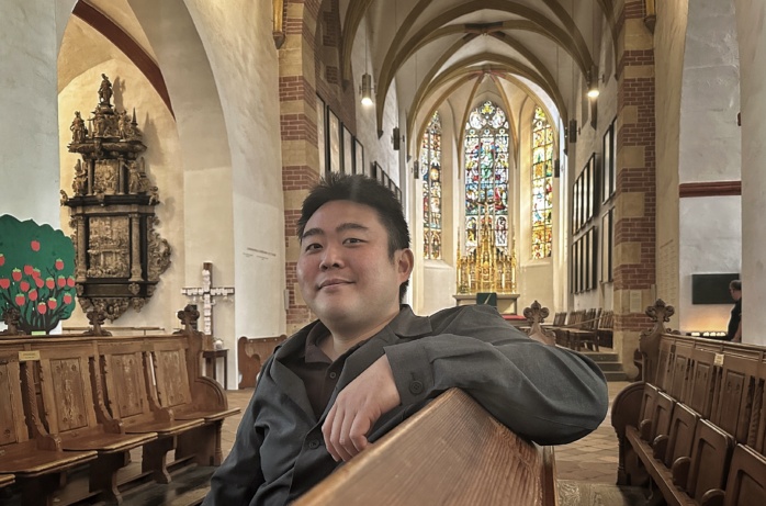 Doch die Töne stammen nicht von himmlischen Wesen. Vor der wuchtigen Statue Johann Sebastian Bachs steht ganz irdisch und unscheinbar ein junger Mann, einfach gekleidet. Schwarze Strubbelhaarfrisur, schwarzes Hemd, ein graues Hemd darüber, blaue Jeans. Es ist Yusuke Matsumura, 1992 in Tokio geboren und aufgewachsen, nach Deutschland gezogen, um ab 2017 in Heidelberg Musik und Gesang zu studieren.