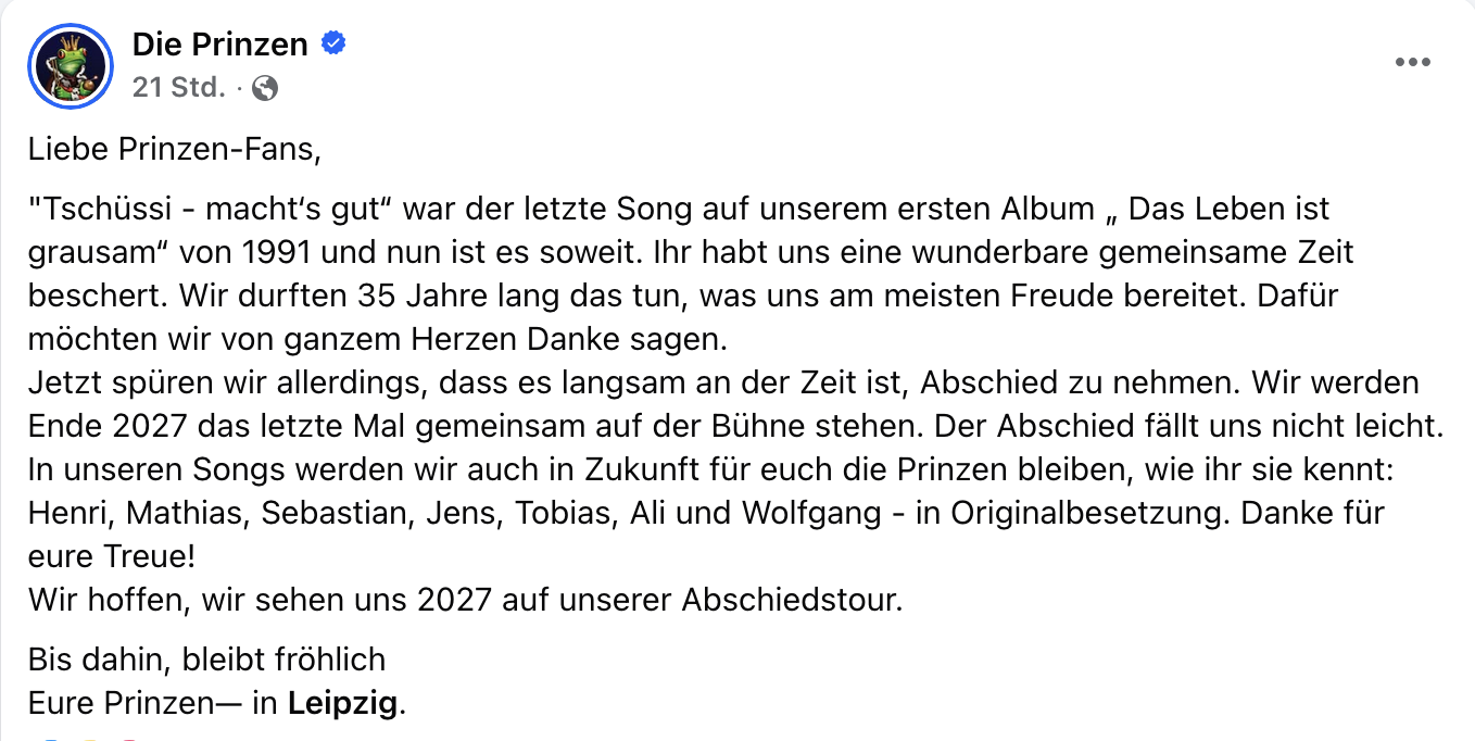35 Jahre, so schreiben die Musiker, hätten sie das gemacht, was ihnen am meisten Freude bereitete. „Jetzt spüren wir allerdings, dass es langsam an der Zeit ist, Abschied zu nehmen. Wir werden Ende 2027 das letzte Mal gemeinsam auf der Bühne stehen.“ Näher gehen die Künstler, zumindest in ihrer öffentlichen Mitteilung, nicht auf die Beweggründe für ihre Entscheidung ein.