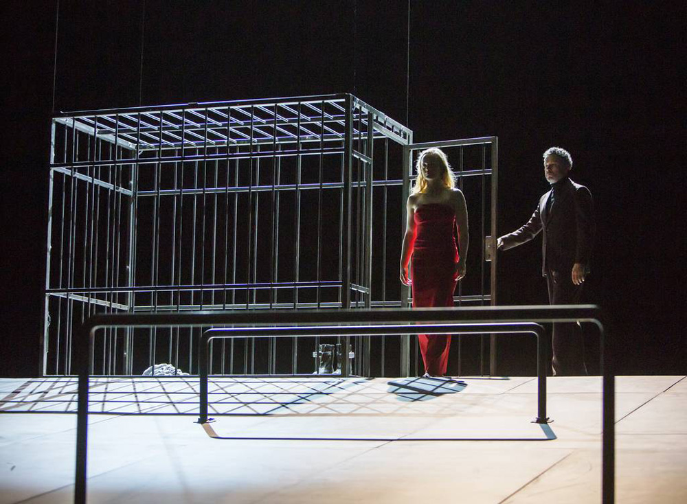 Fünf Akte Schiller in pausenlosen 105 Spielminuten und die Bühne gehört dem Sprechtheater der Schauspieler. Man betont so was in Leipzig neuerdings gern mal, wenn dem so ist. Ein Käfig hängt im Schnürboden, wie man ihn aus „Dreigroschenopern“ kennt. Darin Maria Stuart, wahrlich in der Luft hängend. Im blaugrauen Büßerkleid, kniefrei, langärmelig. Man hat ihr eisenbeschwerte Stiefel angelegt. Nach dem Mord an ihrem Gatten ist sie alles andere als harmlos.