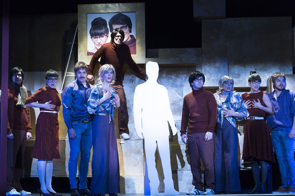 v.l.n.r. : Andreas Range (Chor), Louise Nowitzki (Chor), Alexander Gamnitzer (Paul), Sonja Isemer (Linda), Matthias Walter (Mario), Max Radestock (Chor), Barbara Zinn (Chor), Kerstin König (Chor), Philipp Noack (Chor). Foto: Theater, Oper und Orchester GmbH Halle, Copyright by Falk Wenzel