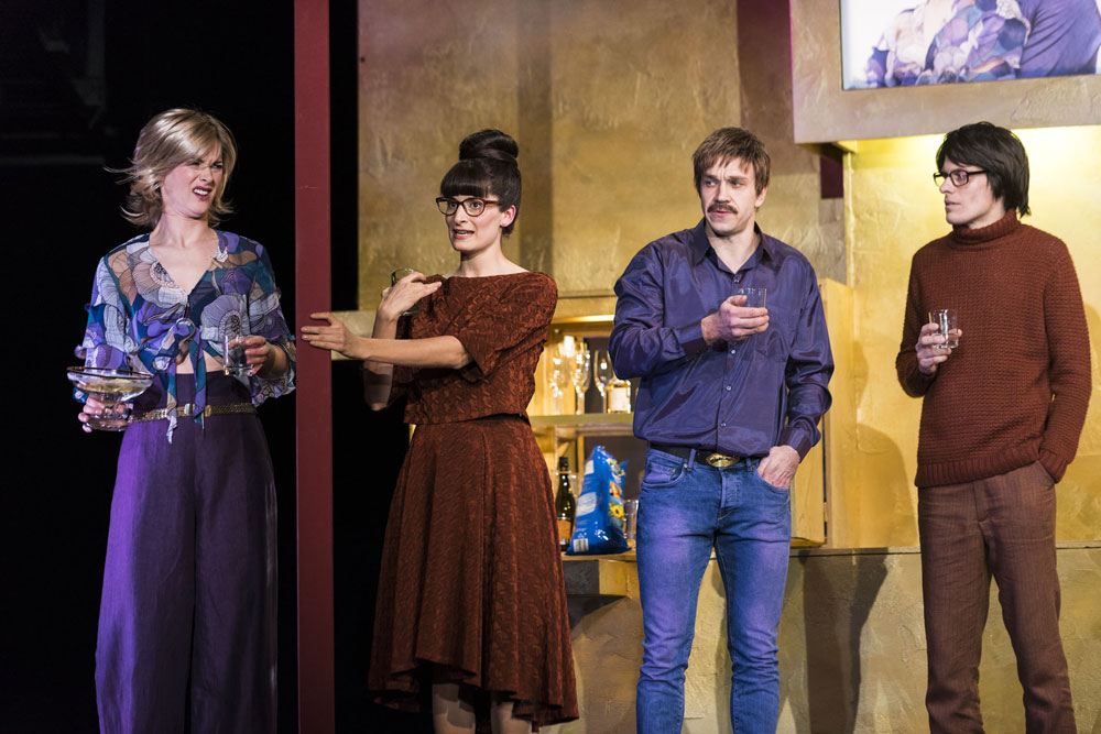v.l.n.r. : Sonja Isemer (Linda), Stella Hilb (Barbara), Alexander Gamnitzer (Paul), Matthias Walter (Mario). Foto: Theater, Oper und Orchester GmbH Halle, Copyright by Falk Wenzel
