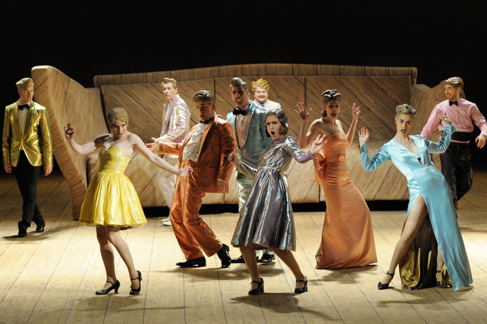 Hier stecken auch traditionelle Hilfen für Aufwärm-Übungen, so man sie nicht schon drauf hat, wie das Aussprechen des Buchstabens „A“ in einer Reihe von Leuten einer nach dem anderen. Zuletzt gibt’s noch eine Massen-Umkleideszene auf dem Sofa, die bunten Fummel werden gegen uniforme Anzüge und Wäsche im Bretterzaun-Look ausgetauscht. Damit geht die Eine-Stunde-Dreißig-Performance zu Ende.