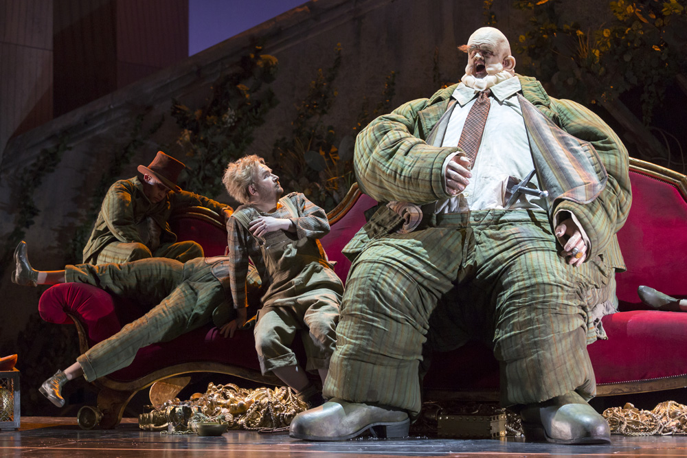 Bühnenbildner Carl Friedrich Oberle hat im “Siegfried” weitere Hingucker kreiert. Im zweiten Akt steigt Wotan von jenem (mittlerweile eingestürzten) Torbogen herab, über den die Götter im “Rheingold” ihre Burg bezogen hatten. Kongenial ist der Einfall, Fafner nicht als Lindwurm, sondern als Riesen darzustellen. Eine monströse Figur, die auf einem roten Plüschsofa sitzt, zu deren Füßen sich der Nibelungenhort erstreckt. Sieht komisch aus, soll komisch sein. Immerhin konzipierte Wagner den “Siegfried”, den zweiten Tag seines Bühnenfestspiels nach dem Vorbild antiker Dionysien, als Komödie.