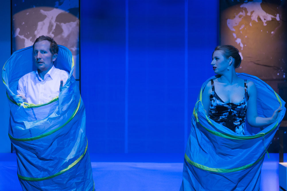 In den beiden Bettszenen menschelt es tierisch. So was geht im Theater fact ohne Ausziehen! Geht wirklich! Zwei Würmer, Lebewesen in Kokons wie Schlafsäcken wurschteln aneinander herum. Bewegung und Geschicklichkeit machen auch hier die Show aus! Stolpern inklusive. Für die andere Bettszene genügt dann ein Laken, da aber ist die Schlafstatt vertikal!