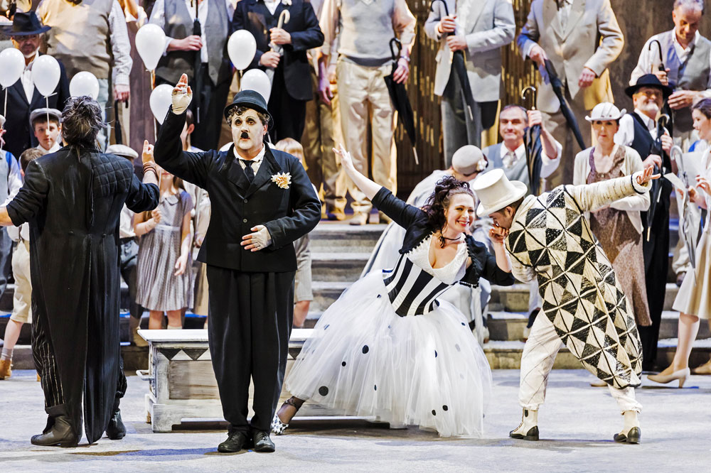 Freilich sieht der Bajazoo anfangs aus wie Charlie Chaplin, als ob Spaß im Ernst hier noch ein Kostüm-Symbol mehr bräuchten, als es die Commedia-Historie mitbringt. Ein Beitrag fürs Charlie-Chaplin-Museum, Abteilung: Oper!, ist es aber schon…