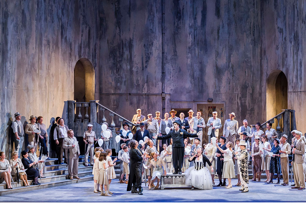 Während der Pause ist der eiserne Vorhang geschlossen und zeigt, dass auch dieses Bauteil in seinen Strukturen, Gelb- und Goldtönen zur Architektur des Saales passt. Man sieht dieses Gerät sonst selten. Weder wegen technischer Notwendigkeit noch künstlerischer Idee. Fahren nun zwei Drittel des Eisernen nach oben und versinkt ein Drittel zwischen Saal und Orchestergraben, blicken wir in einen Hof, vorgeblich Hauptplatz eines kalabrischen Dorfes, nüchternes, fensterloses Grau bis zum Himmel, drei Zugänge. So grau, so grauenhaft für Fantasie oder gar Kunst. Und hier soll die Commedia brillieren!