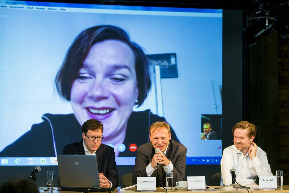 Hausregisseurin Claudia Bauer wurde per Skype zugeschaltet, weil sie wegen des Bahnstreiks nicht nach Leipzig kommen konnte. Foto: Rolf Arnold