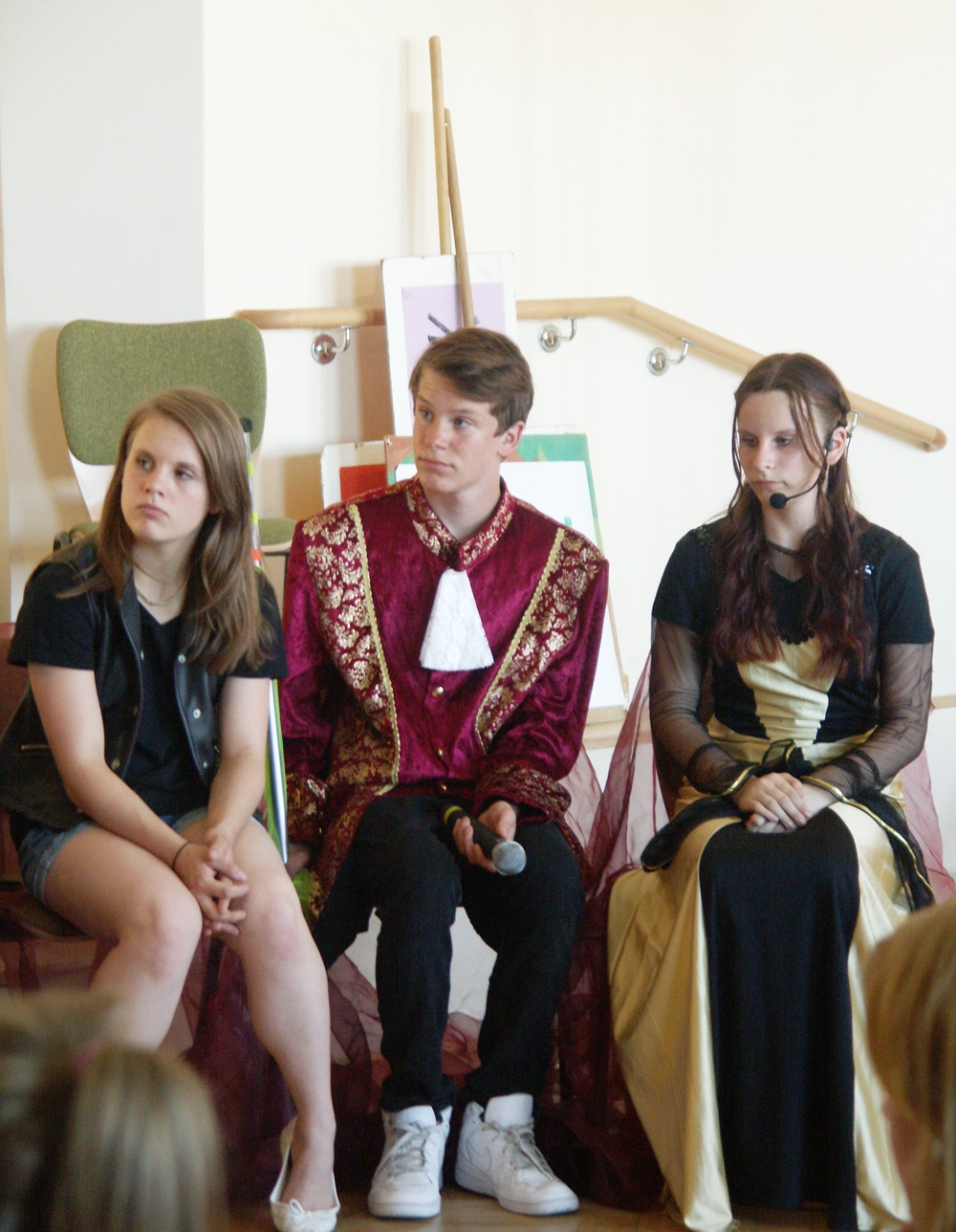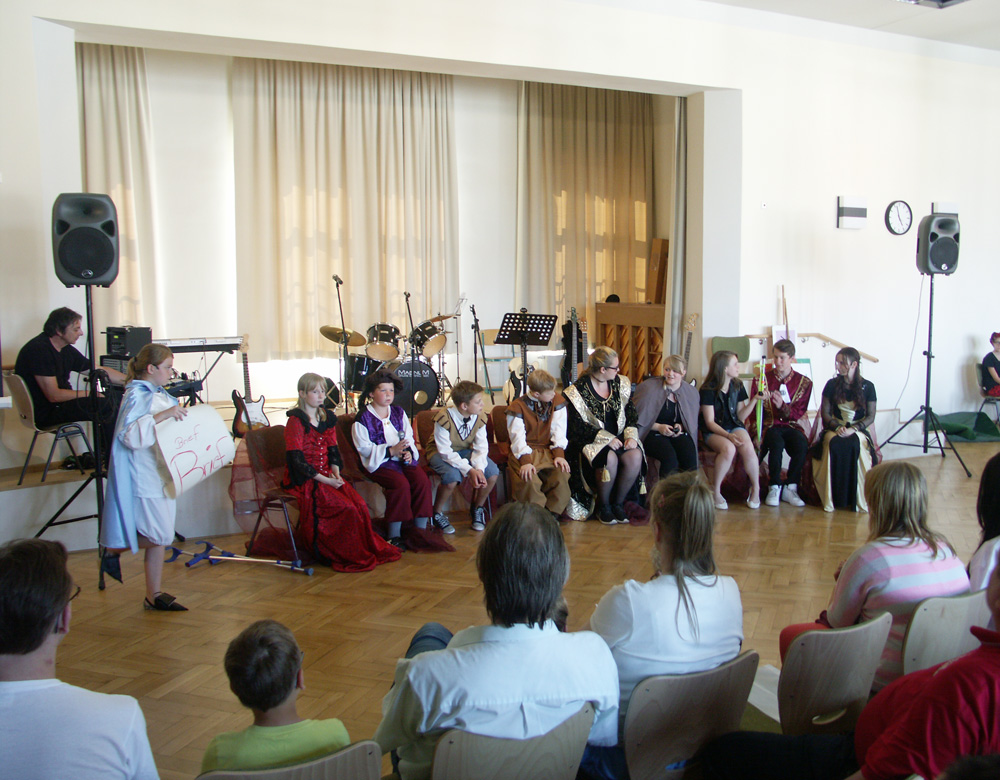 Zum Schuljahresanfang hatte Kerstin Wachenschwanz mit einem Ganztagesangebot „Theater“ begonnen, nun waren 31 junge Leute der Klassenstufen 5 bis 9 am Spiel beteiligt, bis hin zu orientalischem Tanz, Popchor und Schülerband. Diverse Lehrer, Medienpädagogisches Zentrum, Videofilmer hielten Technik und Organisation zusammen.