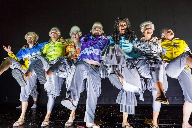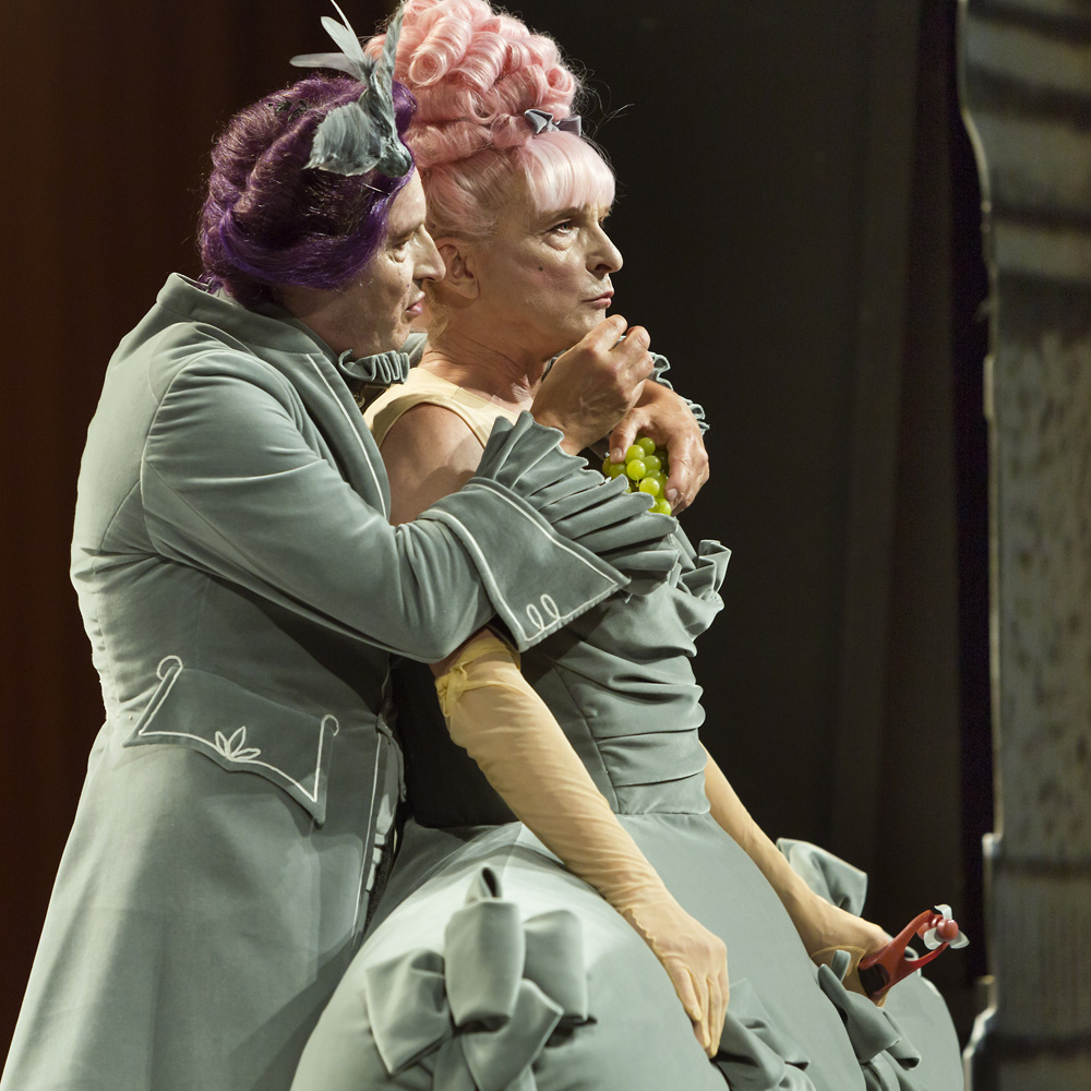 Schon längst sitzt da die Pianistin (Friederike Bernhardt) unter einer riesig-hohen Perücke rechts auf der Vorbühne an den Keyboards. Durch die Tür des Eisernen Vorhangs lugen Partypeople, streuen Konfetti, da hinten scheint man in bester Stimmung zu sein. Wenn die Truppe herauskommt, zeigt sie sich derb-melancholisch in barock-grauen Beinkleidern, barocken Perücken und bunten Hemden wie aus einer beliebigen City-Modeboutique. Josa Marx hat die Kostüme gestaltet, die sich die Darsteller erst anverwandeln. Aus Bunt wird Grau.