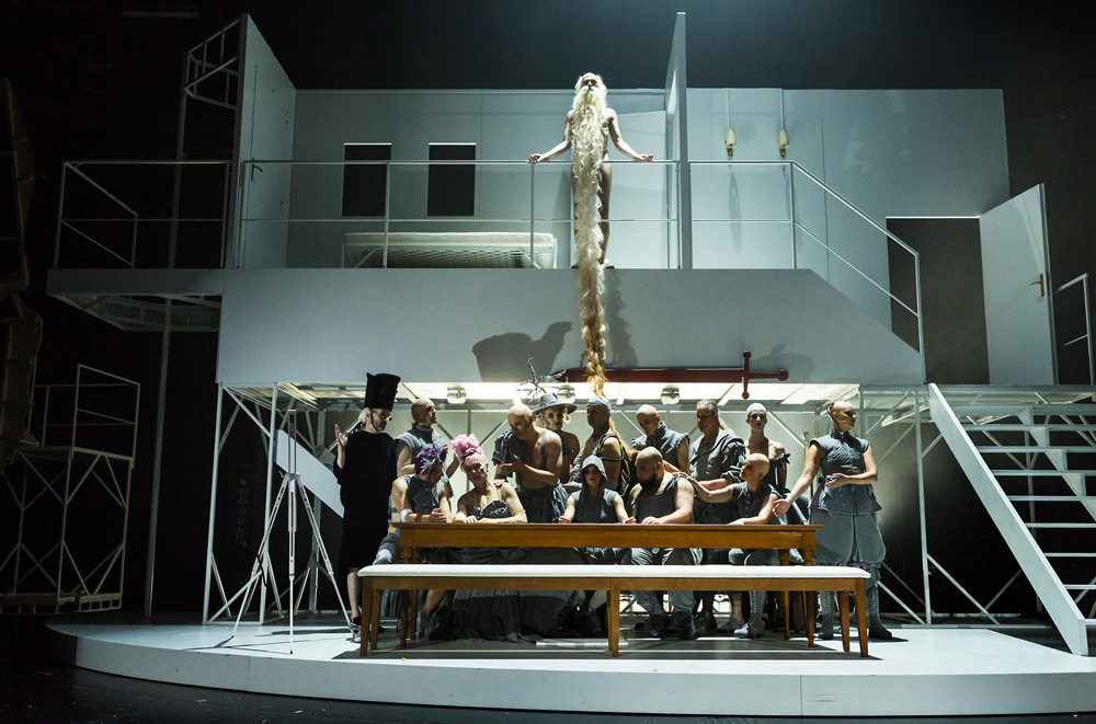 „Du allein bist verworfen!“ wird etliche Male ins Publikum geschrieen und so, als ob das Stück schon zu Ende wäre. Es dauert lange, bevor nicht mehr nur über Tisch und Bänke geschritten wird, sondern man tatsächlich Platz nimmt. Doch das geschieht als Tableau wie zum Gruppenbild an heimischer Tafel.
