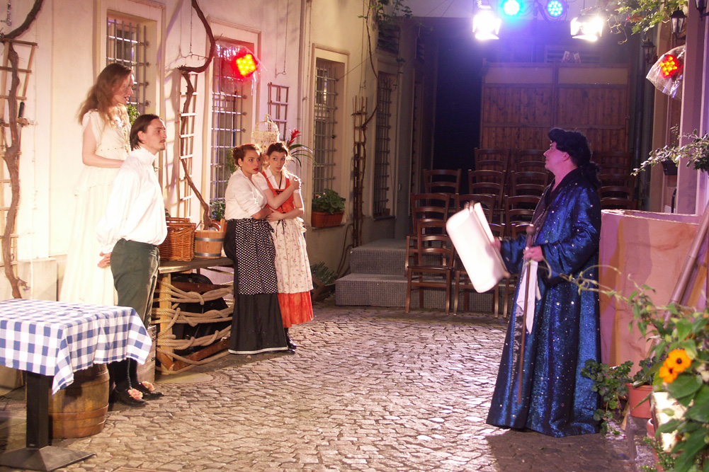 So wurde nichts aus dem Plan, mit dem „Raub der Sabinerinnen“ das Theaterstückschreiben und -spielen selbst zum Thema eines Lustspiels zu machen. Es fand sich ein anderer schöner, aber kleinerer Leipziger Hof, der vermutlich schon lange kein Theater mehr gesehen hat. Wieder stehen sich die Zuschauerreihen gegenüber, diesmal an den Schmalseiten des Hofes, nicht längs wie in der Hainstraße 3.