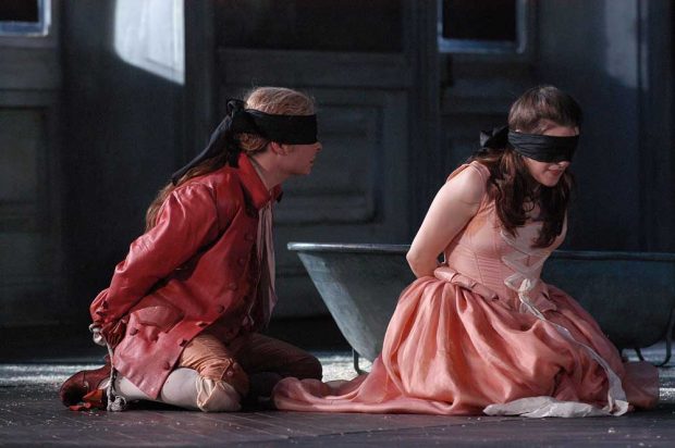 Im Mikrokosmos eines galanten Speisesaals, der bei der Eroberung Wiens einigen Schaden genommen hat, entwickelt sich nun ein psychologisch dichtes Kammerspiel. Belmonte (Sergei Pisarev) möchte seine Konstanze aus Selims Fängen retten, Selim ist untröstlich in Konstanze verliebt, Konstanze kann dem grausamen Herrscher nichts abgewinnen.