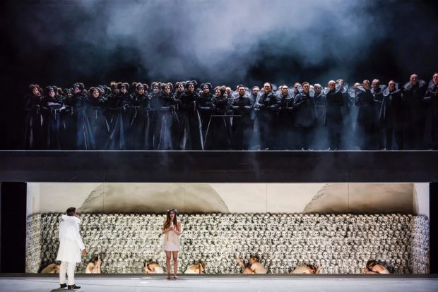 Ein Hingucker ist das Bühnenbild mitnichten. Nur einmal, am Ende des zweiten Akts, gerät der Zuschauer kurz ins Staunen. Die Hauptbühne fährt samt Chor empor. Zum Vorschein kommt die weiß getünchte Unterbühne, die mit unzähligen Schädeln ausstaffiert ist. Don Carlo steht davor, der Vorhang fällt. Visuell überzeugt auch das blutige Finale, in dem sich der Infant schließlich selbst richtet. Bis dahin muss der Zuschauer jedoch viel ereignisloses Dialog-Gewitter über sich ergehen lassen. Wenigstens behandelt Peters-Messer den Stoff nicht abstrakt, sondern übt sich immerhin als Geschichtenerzähler.