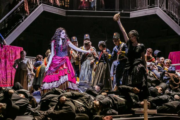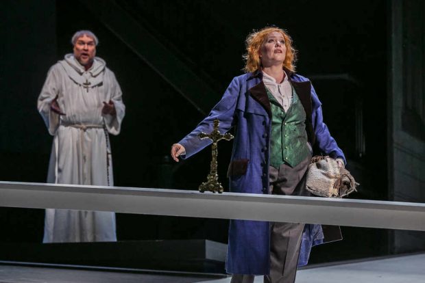 Keith Warners Adaption von Verdis „La Forza del Destino“ (dt. Die Macht des Schicksals) endet mit einer Überraschung. Statt sich mit dem Schicksal seiner Geliebten Leonora abzufinden, stürzt sich Don Alvaro krachend in den Tod. Das unerwartete Ende ist das einzige Ausrufezeichen der ansonsten schwachen Inszenierung.