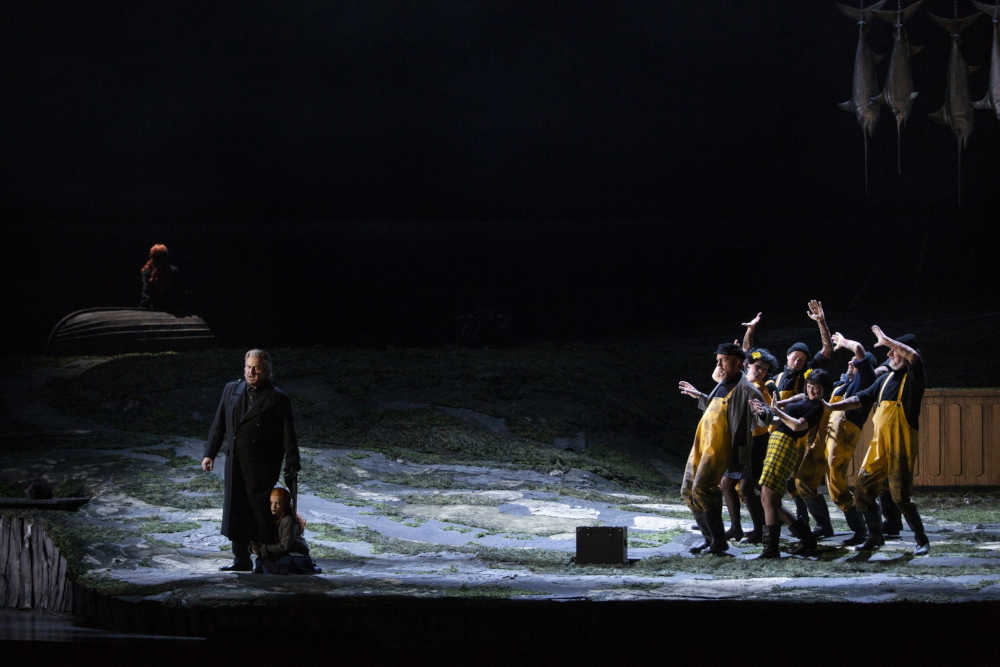 Florentine Kleppers Inszenierung aus dem Wagnerjahr 2013 ist ein bisschen wie Kino. Während des Vorspiels, von Thielemann temporeich dirigiert, peitschten animierte Regenschauer über den transparenten Vorhang vor dem Strand, der den Bühnenraum ausfüllt. Die Szene erinnerte nicht zufällig an Landschaftsmalereien Caspar David Friedrichs und Max Klingers. Dunkle Lichtstimmungen und zuckende Blitze untermalten die in satten Farben aus dem Orchestergraben tönenden Kapriolen, mit denen Wagner im Vorspiel die stürmischen Naturgewalten nachzeichnet.