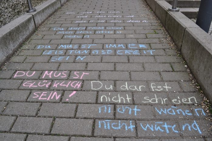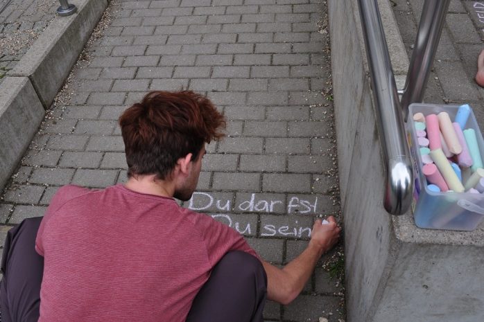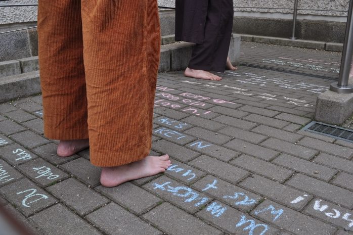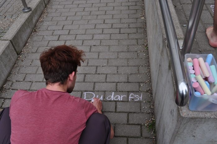 „Hier im Workshop, wenn die Sachen auf den Boden geschrieben sind, merkt man erst, was vor allem die gesellschaftlichen Normen eigentlich für Kleinigkeiten sind“, sagt eine der Teilnehmer/-innen. „Dann fragt man sich, warum es einem so schwerfällt im Alltag einfach darüber hinwegzugehen.“